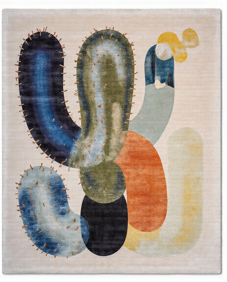 This series of hand-knotted silk and wool textiles reimagines the cactus as a sculptural, abstract form vibrant, soft, and alive with movement. Each piece transforms desert botany into fluid shapes and luminous color fields, blending organic silhouettes with painterly gradients.